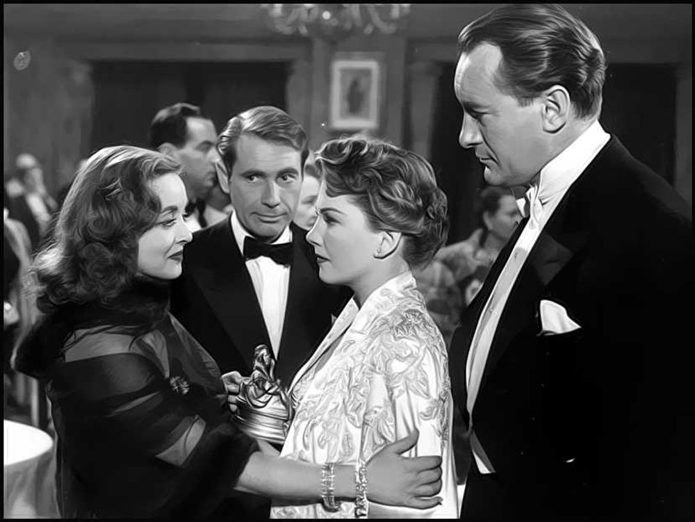 Margo Channing is one of the biggest stars on Broadway. But having just turned forty she is worried about what her advancing age will mean for her career. Tattered and forlorn, aspiring actress Eve Harrington shows up in Margo's dressing room, weaving a melancholy life story to Margo and her friends. Taking pity on the girl, Margo takes Eve as her personal assistant. Before long, it becomes apparent that naïve Eve is actually a Machiavellian conniver who cold-bloodedly uses Margo, her director Bill Sampson, Lloyd's wife Karen, and waspish critic Addison De Witt to rise to the top of the theatrical heap.