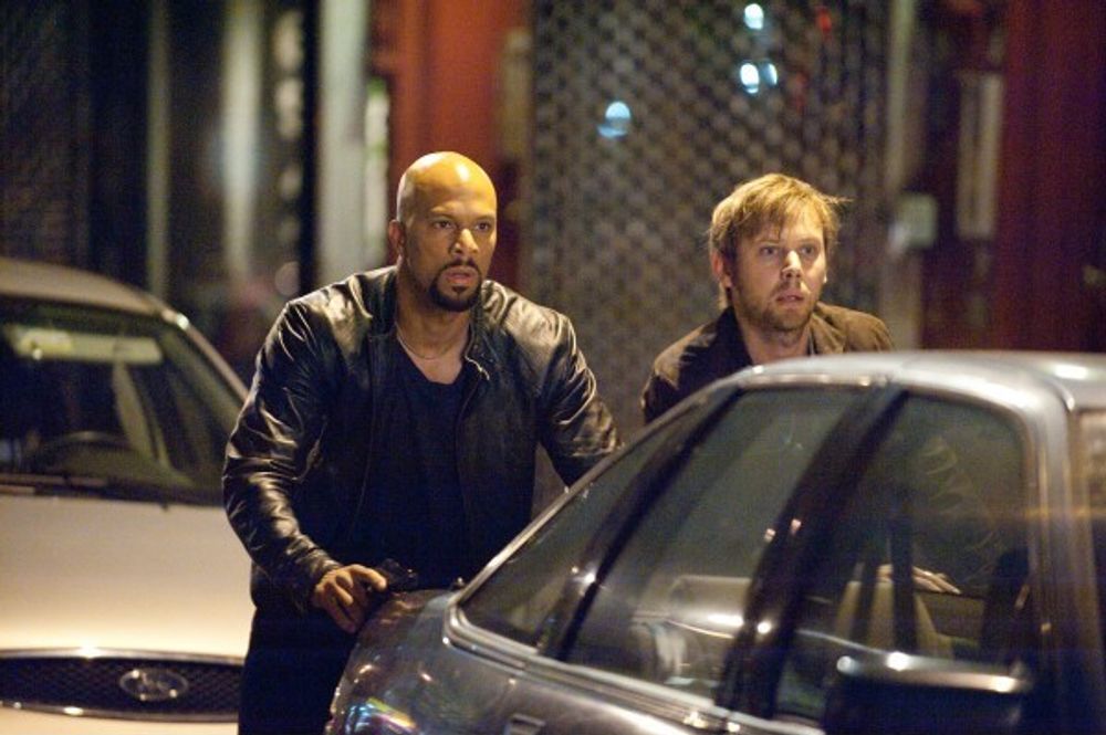 As they're about to finish, a couple of tough-looking guys - Armstrong (Jimmi Simpson) and Collins (Common) - walk up to their table and address them as the "Tripplehorns". They tell them that they're in trouble. The Fosters think that they've been busted for taking someone else's reservation. Armstrong and Collins escort them outside, where they frisk them and take their IDs and cell phones. Claire and Phil are a bit shocked and ask what this is about. Armstrong pulls out a gun and holds it sideways at Phil, freaking out Phil ("sideways means killshot!"). They tell them that they want the flash drive that they stole from mob boss, Joe Miletto, and are now using as blackmail. As the situation gets tenser, Phil says that he has the flash drive and that it's in Central Park.