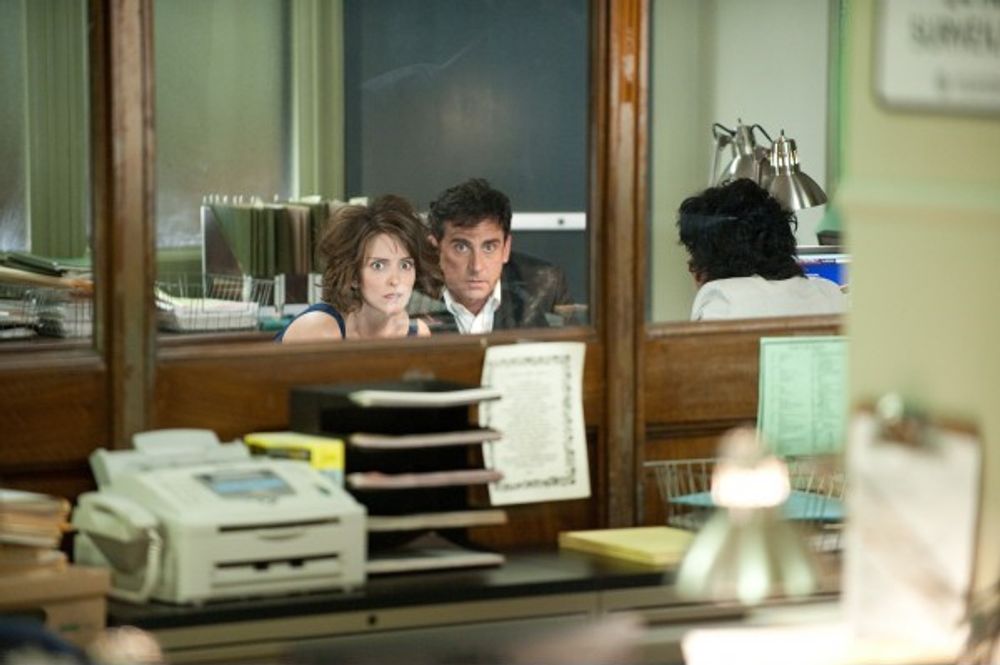 Claire (Tina Fey) and Phil Foster (Steve Carell) sleep peacefully in their bedroom, till they're jumped on by their kids, who demand breakfast. During breakfast, Claire gives her daughter a one-two-three warning, and is amazed that it still works. Phil makes the kids' lunches, but he's left all the drawers open, resulting in Claire almost tripping on them. Phil is a New Jersey tax lawyer and Clair is a realtor. When they get back home, they're totally bushed. Katie, their next-door neighbor, drops by. She tells them that she's here to baby-sit, as it's their Date Night. Though neither is really feeling up to it, they go to a restaurant for their date. They have potato skins and salmon (their usual) and watch other couples and analyze their actions, quite comically. Still their date is rather boring and they return home. Phil wants to fool around before sleeping, but Claire's already put in her retainer. He gets grossed out when she removes it and they spend yet another night without sex.