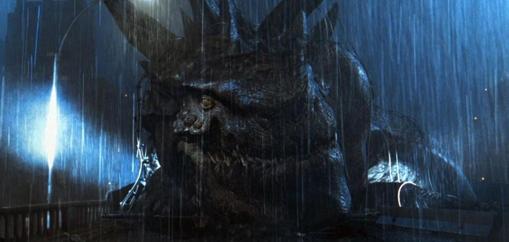 In pursuit of the quartet, Godzilla eventually makes its way to the Brooklyn Bridge. The creature becomes trapped in its steel suspension cables, making it an easy target. After being successfully struck with missiles by military aircraft, it collapses (smashing the cab under its jaw) and slowly dies. Meanwhile, amidst the Garden's ruins, a lone egg has survived the aerial bombardment and begins to hatch.
