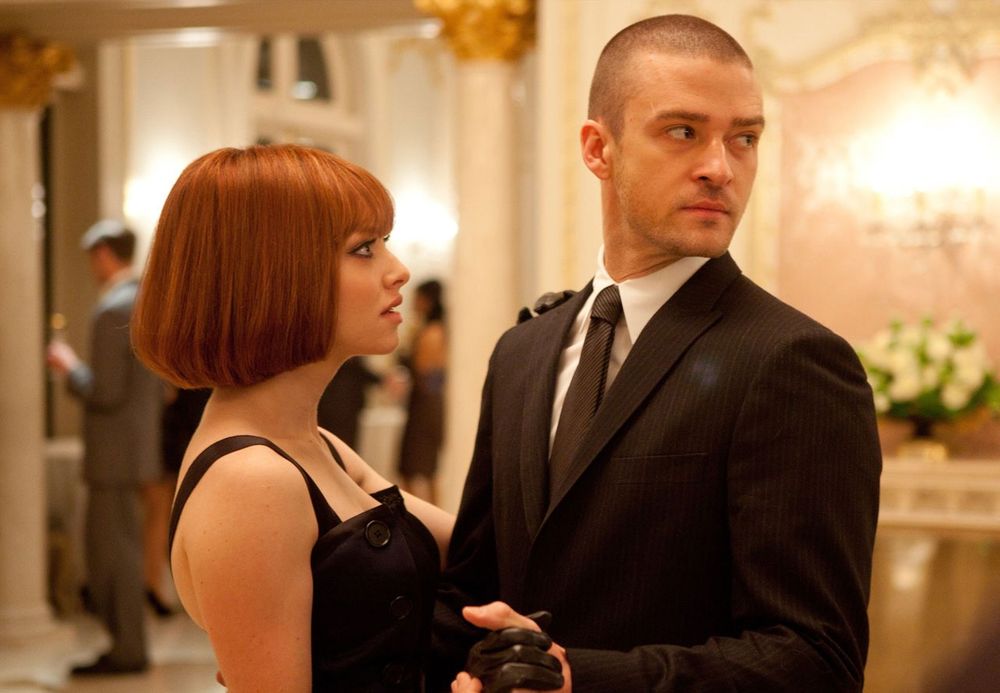 At the casino, a tuxedoed Will meets Phillipe Weis (Vincent Kartheiser), arguably the richest man in the world. At a high stakes poker game, Will goes all in and comes out as victor, now with over 1000 years. Phillipe is impressed, as is Sylvia (Amanda Seyfried), his beautiful but sheltered daughter, the girl from the restaurant. Phillipe invites Will to his mansion for another party, and partially to see Sylvia again, Will agrees. Knowing to be prepared, he purchases a Jaguar E type and drives to the Weis mansion on the coast. There Phillipe reintroduces him to Sylvia, as well as his wife Michele (Bella Heathcote) and mother-in-law, all three of whom look the same age due to their wealthy background. The women are followed by guards all the time, but Will convinces Sylvia to let loose and have fun. Feeling oppressed by her father and his men, Sylvia agrees and the two go skinny dipping in the ocean. Sylvia admits wishing that she could often do something wild and crazy. Phillipe had always restricted his family members though, and sure enough he soon comes looking for her. Sylvia and Will manage to dress and make themselves presentable again when the Timekeepers appear and confront Will.