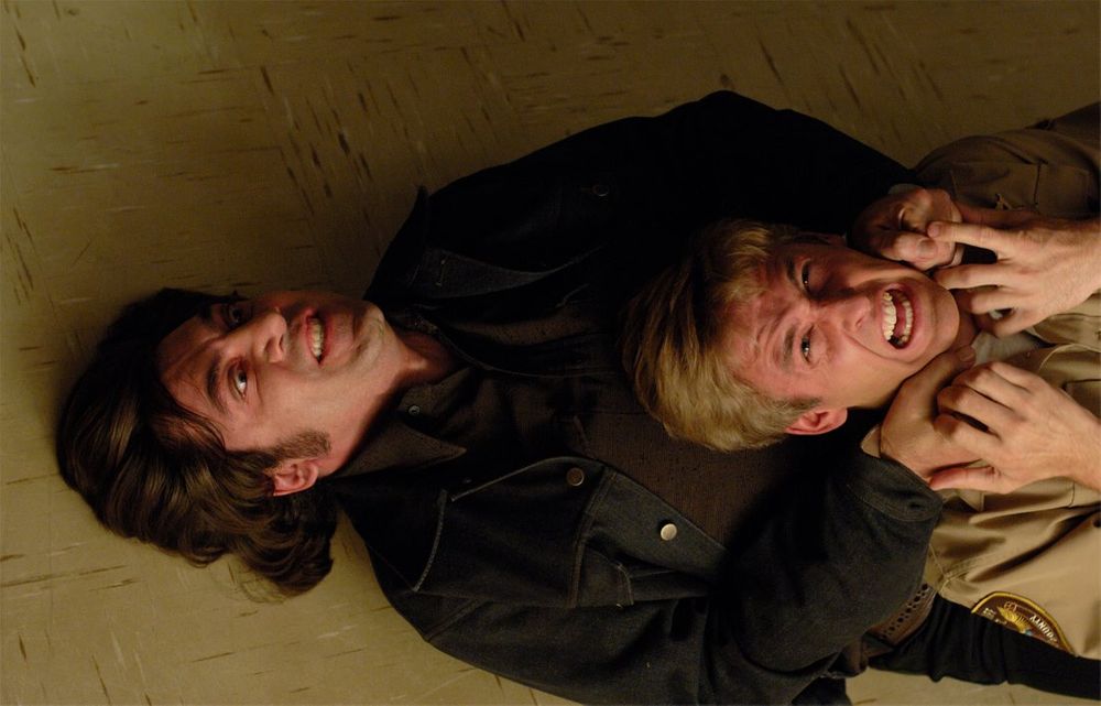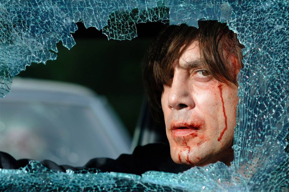 Anton Chigurh (Javier Bardem) is a ruthless hitman who has been hired to recover the money. He has already strangled a sheriff's deputy to escape custody and stolen a car by using a captive bolt pistol to kill the driver. He tracks Moss to his hotel with the aid of a transponder hidden inside the case. Chigurh makes entry into Moss' hotel room, ruthlessly slaughtering the Mexicans preparing to ambush Moss.