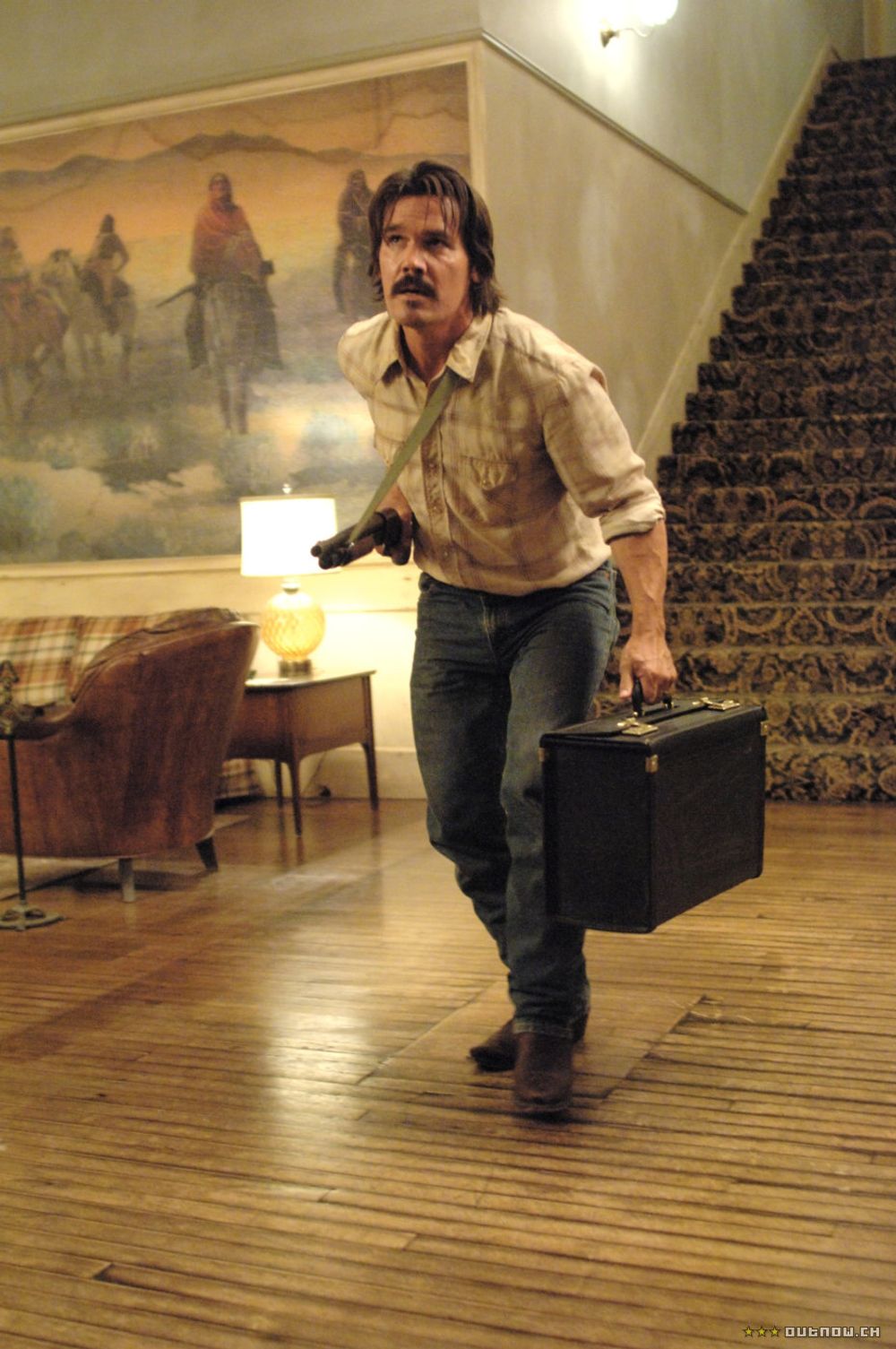 Returning home he retrieves the money, sends his wife Carla Jean (Kelly Macdonald) to be with her mother, and makes his way to a motel in the next county, where he hides the case in the air duct of his room.