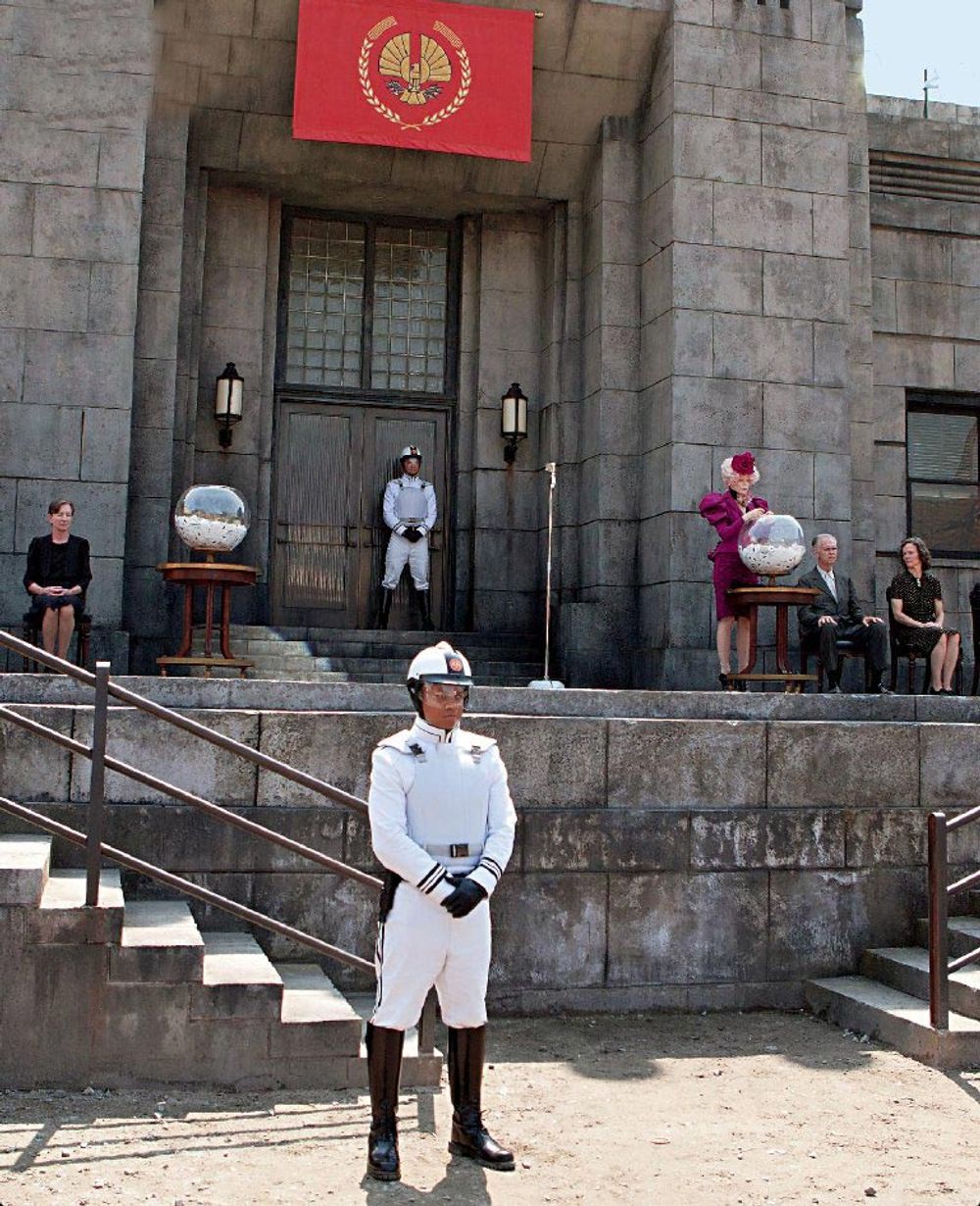 After Katniss volunteers for Prim, it shows the crowd putting three fingers over their lips and kissing it as a sign of respect. You can clearly see a man in the crowd wearing black with a camera. This is often mistaken as a goof but remember that the 'Reaping' is being televised across Panem.